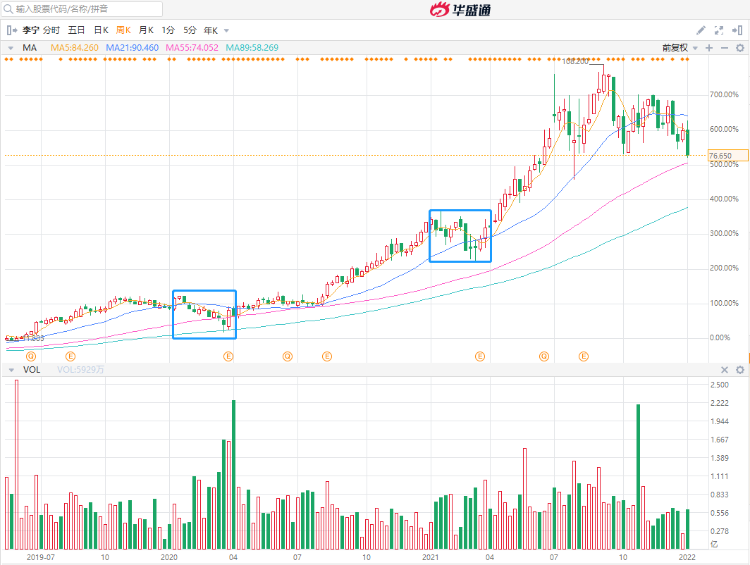 但到了2022年,情况好像被扭转了。虽然恒指还未全面转强,但截止发稿上涨1.5%,新年第一周有望收涨。而李宁的走势却较为拉胯,截至发稿,李宁下跌3.5%,新年第一周累计跌幅或超11%。在恒生指数成分股中,或仅仅好于药明生物(-13%)和碧桂园服务(-14%)。