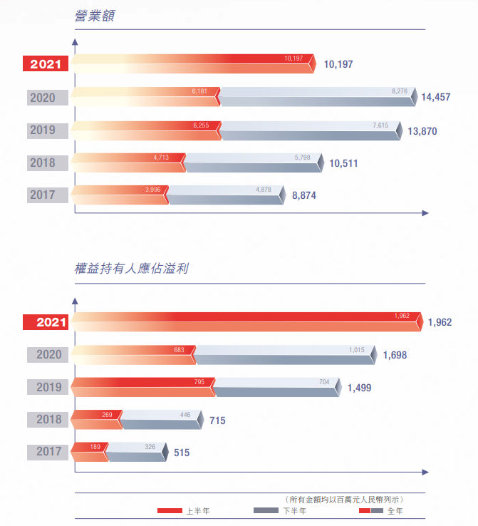 进入2021年,公司业绩增长更为强劲。从已披露的2021年中报来看,上半年营收已达约102亿元,远超2020年同期的61.8亿。持有人应占溢利方面甚至已超过2020年全年,达到19.6亿。