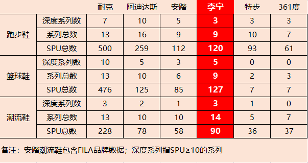 如产品单价较高、科技投入较多且市场需求较广的跑步鞋、篮球鞋、潮流鞋等品类,李宁在系列篮球鞋和潮流鞋方面,丰富度已经与阿迪达斯不相上下了,且在国内品牌中处于领先。