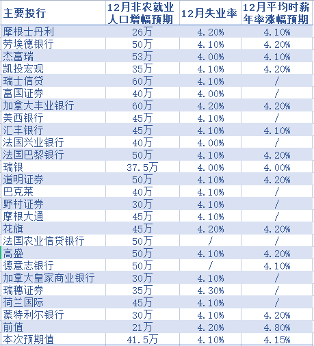24家大型投行预测显示,主要投行对12月非农就业人口的增幅预期差距较大,但失业率和平均时薪年率预期较为接近。具体而言,美国12月季调后非农就业人口增幅料介于26万-60万,失业率料介于4.0%-4.3%,平均时薪年率增幅料介于4.0%-4.2%。