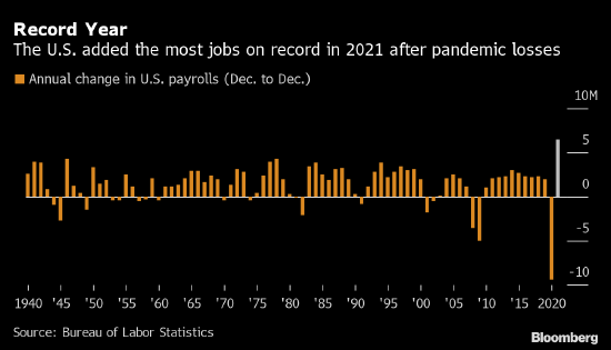 美国经济2021年创纪录新增640万就业,在前一年疫情导致空前就业损失之后强劲反弹。