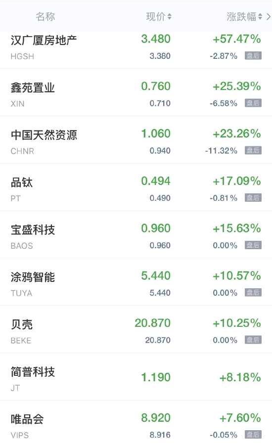 领涨中概股列表: