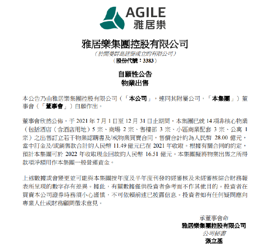 1月10日消息,雅居乐集团:于2021年7月1日至12月31日止期间,本集团已就14项非核心物业之出售订立若干物业认购书及/或物业买卖合同,售价合计约为人民币28.00亿元,当中订金及/或销售款合计约人民币11.49亿元已在2021年收取。根据有关合同的约定,预计本集团可于2022年收取现金回款约人民币16.51亿元。本集团拟将物业出售之所得款项净额用作本集团一般营运资金。