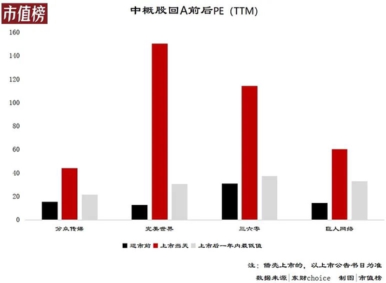 历史上的分众传媒、巨人网络、完美世界等公司在美股退市前的市盈率均远低于在A股,尤其是刚在A股上市时。