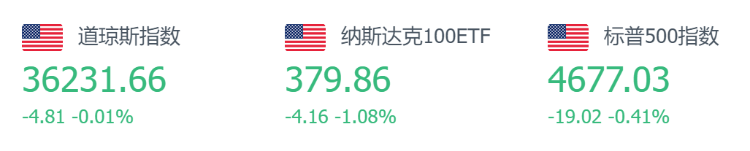 美股上周五收跌,三大股指当周均录得跌幅。道指跌4.81点,跌幅为0.01%,报36231.66点;纳指跌144.96点,跌幅为0.96%,报14935.90点;标普500指数跌19.02点,跌幅为0.41%,报4677.03点。