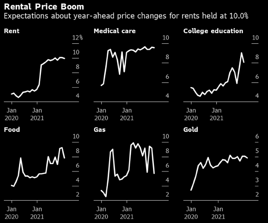 美国人预计住房和医疗保健等类别的价格上涨速度会更快,这些产品占据了家庭支出的很大一部分,而且很难被替代。对租金,医疗和大学学费的涨幅预期都高于8%。受访者预计,未来一年食品价格涨势将减弱,价格涨幅将降至7.8%,为7月份以来的最低水平。