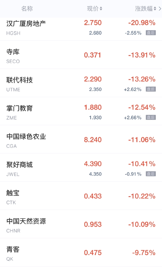 寺库跌近14%,联代科技跌超13%,掌门教育跌超12%,携程跌超7%,趣头条跌超5%,新东方跌近5%,前程无忧、怪兽充电跌超4%,开心汽车跌超3%,中网载线、斗鱼跌近3%,凤凰新媒体、雾芯科技、乐居、36氪、微美全息、优信跌超2%,虎牙、阿里巴巴跌超1%。