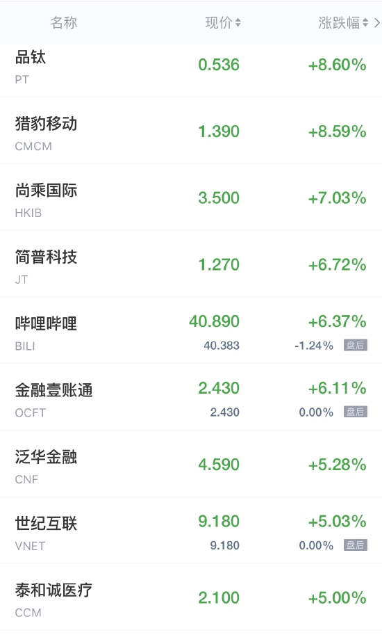 猎豹移动涨超8%,哔哩哔哩涨超6%,世纪互联涨超5%,汽车之家涨近5%,爱奇艺、途牛涨超4%,中通涨近4%,人人公司涨超3%,网易有道、满帮、涂鸦智能涨超2%,京东、拼多多、腾讯音乐涨近2%,贝壳、金山云、搜狐、腾讯ADR、台积电、新氧涨超1%。