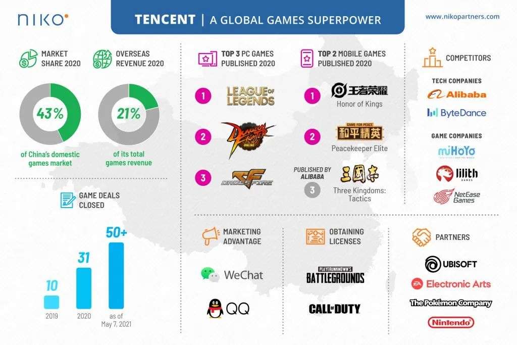 直到年底,数据机构Niko partners分析师Daniel Ahmad在推特指出,仅2021一年,腾讯就收购和投资超过100家游戏公司,相当于每3天一家,可谓创造了全球纪录。