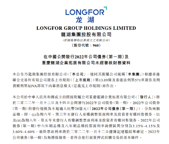 龙湖集团在港交所公告,计划公开发行不超过28亿元人民币公司债券,分为两种年期。6年期品种的票面利率询价区间为3.15%-4.15%,8年品种为3.60%-4.60%。最终票面利率将于1月12日根据簿记建档结果确定。