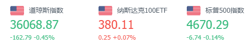 美股周一收盘涨跌不一。纳指跌逾400点后反转收高,结束此前连续4个交易日下跌的行情。道指跌162.79点,跌幅为0.45%,报36068.87点;纳指涨6.93点,涨幅为0.05%,报14942.83点;标普500指数跌6.74点,跌幅为0.14%,报4670.29点。