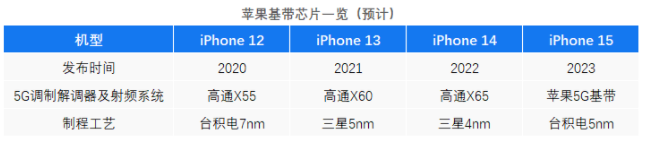 据供应链消息称,苹果公司2022年推出的iPhone 14将搭载三星4nm制程的高通5G芯片X65及射频IC,搭配苹果A16应用处理器。而苹果2023年推出的iPhone 15将首度全部采用自研芯片,其中5G芯片会采用台积电5nm制程,射频IC采用台积电7nm制程,A17处理器将采用台积电3nm量产。