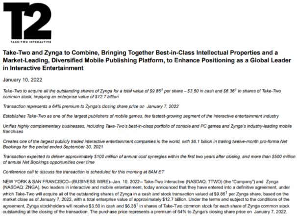 《侠盗猎车手》开发商RockStar母公司Take-Two宣布,将作价约127亿美元收购社交游戏开发商Zynga。Zynga代表作包括美国版开心农场系列、《珍宝岛》等。具体而言,这笔交易给到Zynga每股9.86美元的报价,这个价格较Zynga上周五的收盘价溢价接近64%。