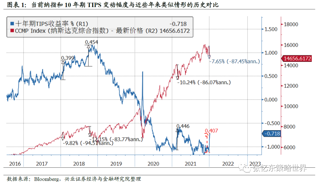 回顾长端利率陡升引发的调整,2018年2月美国股债共振调整,2018年10月鲍威尔暗示加息之途慢慢长路,2021年2月经济预期大反转,这些时间段10年期TIPS收益率(实际利率)短期陡升的幅度分别为39.9bp 、45.4bp、 44.6bp。当前,截至美东时间2022年1月10日,近期10年期TIPS收益率(实际利率)的从局部低点短期大幅走高盘中一度达40bp。