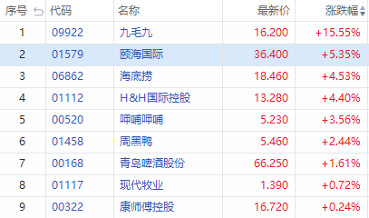 华盛资讯1月12日消息,餐饮股集体反弹,九毛九涨超15%,颐海国际涨超5%,海底捞涨超4%,呷哺涨超3%。