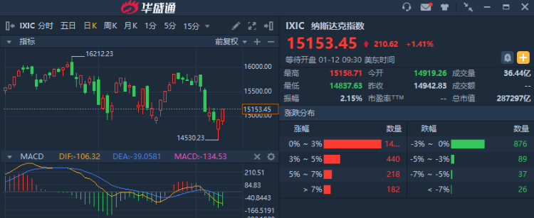 上周,纳斯达克连续四天下跌,从11月的创纪录高位下跌逾8%,纳斯达克综合指数蒸发1.1万亿美元。周一,纳斯达克指数在早盘暴跌之后,尾盘反弹收高,周二继续收涨1.4%,创1月4日上周二以来收盘新高,连涨两日。