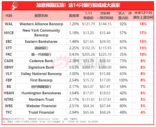 那么,在美股市场中如此多的银行股应该关注哪些呢?Marketwatch整理了华尔街分析师青睐的14只银行股,这些股票挑选自KBW银行指数覆盖的76家银行股,有望在2021年至2023年期间实现10%符合增长率: