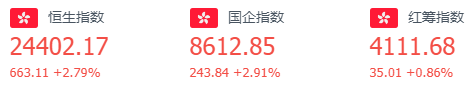 昨日港股高开高走,截至收盘,恒生指数涨2.79%,报24402.17点,国企指数涨2.91%,红筹指数涨0.86%。恒生科技指数涨近5%,京东集团涨近11%,美团涨超9%,网易涨近7%,快手涨超6%。汽车股涨幅居前,小鹏汽车涨近10%,理想汽车涨超8%,长城汽车涨近6%,比亚迪股份涨7.63%。