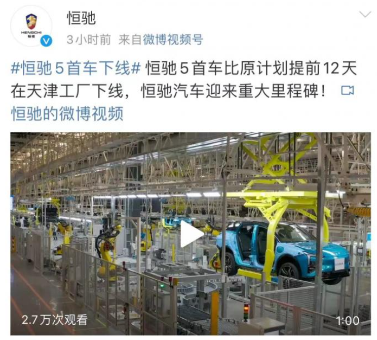 恒大汽车品牌恒驰官方宣布,恒驰5首车比原计划提前12天在天津工厂下线。不过有消息称,恒驰5目前处于PT0(小批量试制)阶段,现在只是总装下线,预计正式量产要等到今年8月。