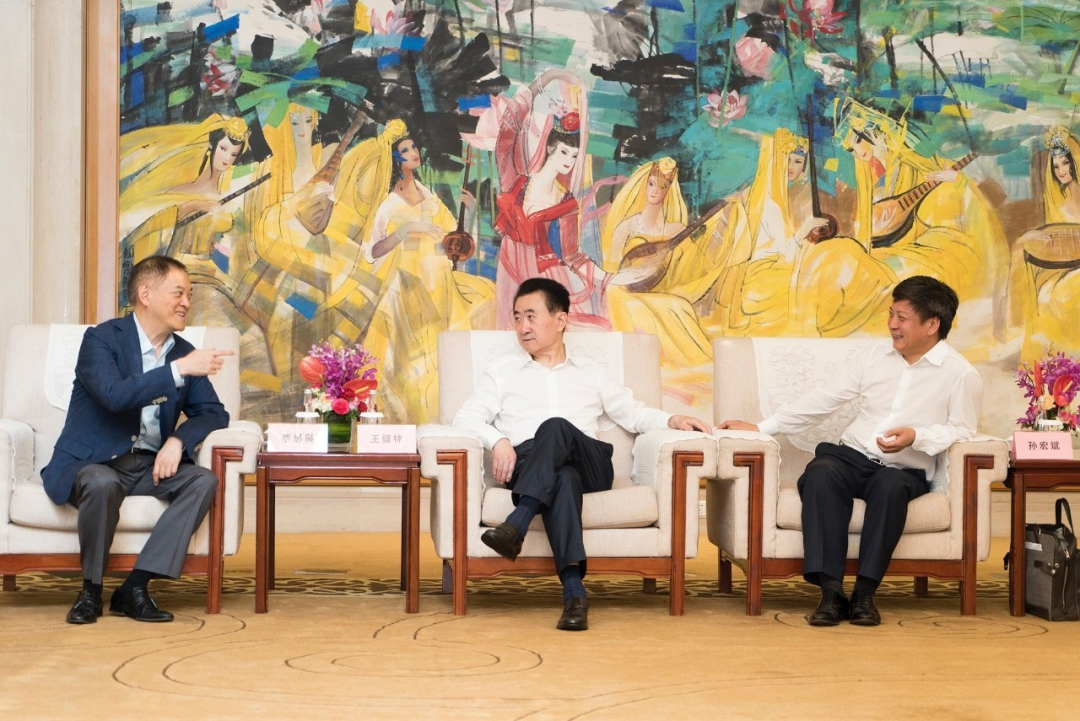 王健林、孙宏斌、李思廉在会议室谈笑风生