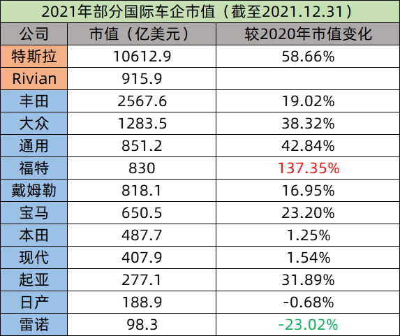 从2021年市值变化上来看,选择积极转型的福特、通用、大众等公司均得到20%以上的市值增长;而“保守派代表”现代、本田、日产等车企则表现平平。