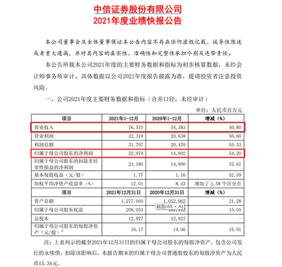 1月12日,中信证券发布2021年度业绩快报公告,为首家披露2021年度业绩的上市券商。