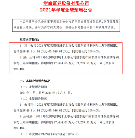 1月8日,浙商证券发布2021年度业绩预增公告称,预计公司2021年度的归母净利润将实现同比增加约4.88亿元-6.51亿元,同比增长约30%-40%;预计归属于上市公司股东的扣除非经常性损益的净利润,将实现同比增加约4.74亿元-6.33亿元,同比增长约30%-40%。