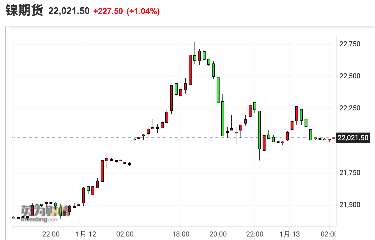 随着伦敦金属交易所(LME)的仓库库存连续第51天下降,伦镍盘中一度上涨4.4%至每吨22745美元,创下2011年8月以来的最高水平。