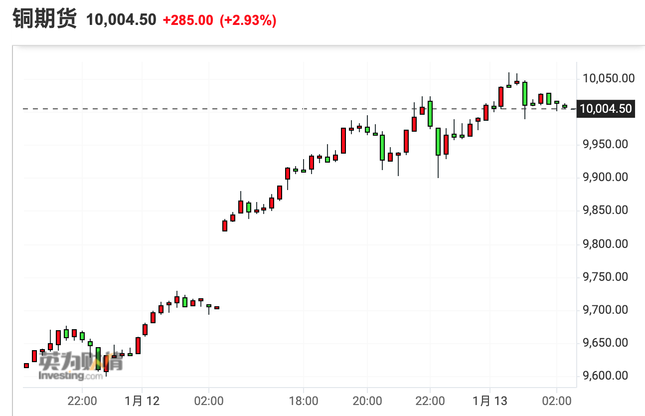 伦铜周三盘中触及每吨10034.50美元,自去年10月21日以来首次站在1万美元上方。