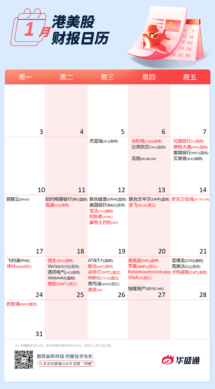 时间来到1月中旬,在1月的中下旬,港美股财报或迎来众多的重磅财报,其中市场关注度较高的股票有苹果、特斯拉、微软、台积电、奈飞、新东方在线、英特尔、VISA、高盛、摩根士丹利、阿斯麦、等明星企业的最新业绩。这些公司财报或将成为助推市场的积极因素。