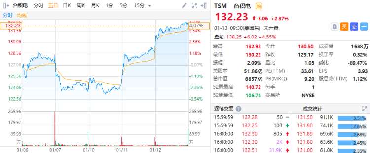 台积电盘前涨超4%,第四季度净利润约60亿美元,同比增长16.4%。