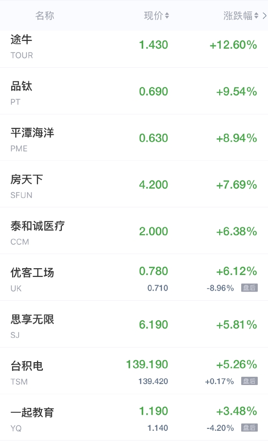 途牛涨超12%,房天下涨超7%,一起教育涨超3%,中网载线涨超2%。