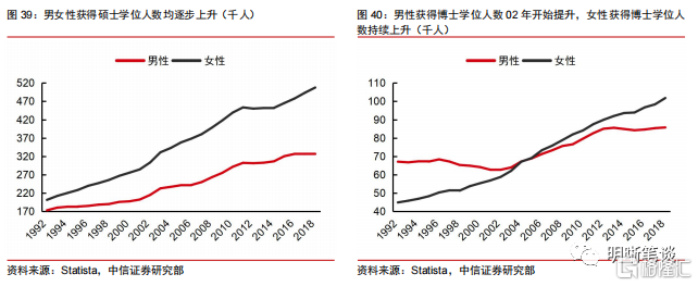 2007年后高学历女性参与率下降增速提升为女性参与率下降的主要因素,预计高学历人口参与率下降的趋势较难改变。除了学历低于高中的女性,其他学历女性劳动参与率2007年后下降速度提升,结合各学历女性占比变化,2007年后学士及以上学历的女性对于女性劳动参与率有较大且持续的负贡献,女性劳动参与率下滑幅度因此增大。此外,男性和女性高学历人口参与率均持续下降,并且07年后下降增速提升,这可能是因为在教育水平提升背景下,高学历人口拥有更多机会获得更高的学历,推迟了他们进入劳动力市场的时间。随着经济发展,教育水平以及普及性将不断提升,预计高学历人口参与率下降的趋势较难改变。
