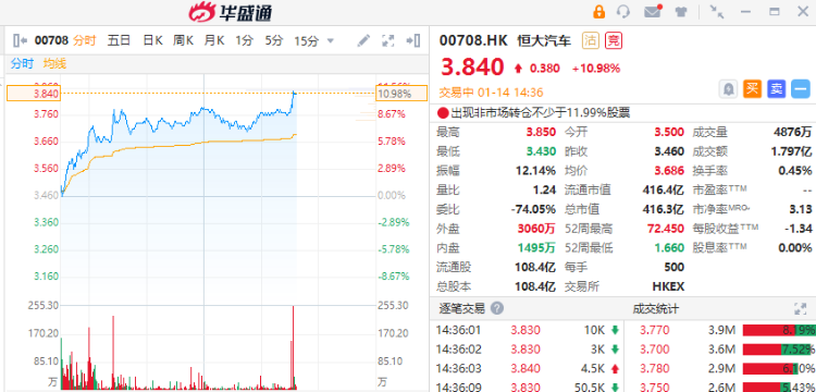 华盛资讯1月14日消息,恒大汽车(00708)今日反弹走高,午后短线上扬,涨幅扩大逾10%,最新报3.84港元,成交1.79亿港元。