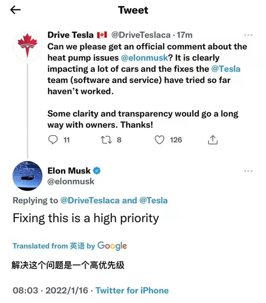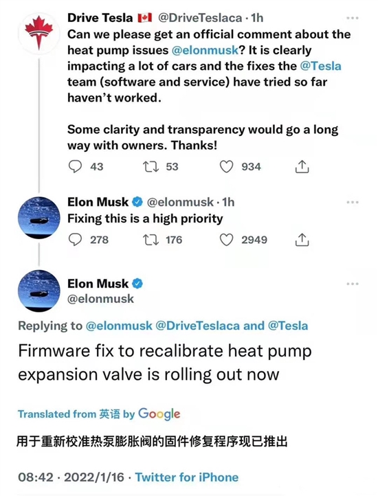 该问题爆发后,马斯克在社交平台回复网友时明确表示“Fixing this is a high Priority(解决该问题是一个高优先级)”,同时他还表示,用于重新校准热泵膨胀阀的固件修复程序现已推出。