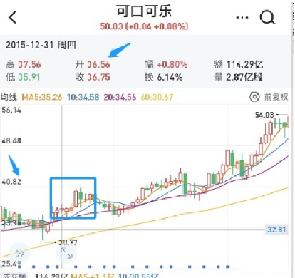 那么问题来了:在可口可乐业绩没有大幅改善情况下,K线图后半部分为什么上涨那么多?一路涨到54.03,这里是不是就是高估了?该做空了?