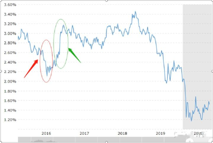 绿色圆圈里显示的是2016年年中后,利率一路走高,最高到 3.2%,对应的下半年可口可乐公司的股价表现:最低有跌到过 35.23。