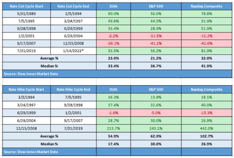 事实上,自1989年以来,在美联储加息期间,道琼斯工业平均指数的平均回报率接近55%,标准普尔500指数的回报率为62.9%,纳斯达克综合指数的平均正回报率为102.7%。美联储降息期间也会产生强劲的收益,道指平均上涨23%,标普500指数上涨21%,纳斯达克指数上涨32%。