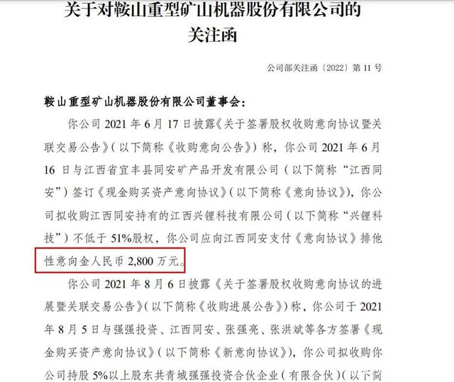 2021年6月16日,鞍重股份就宣布,拟收购江西同安持有的江西兴锂的51%股权。同年8月,其再度对外宣布直接收购向强强投资旗下江西同安的51%股权,这样不但控制江西兴锂,还可以控制江西同安旗下的另一家公司――江西鼎兴。