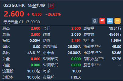 华盛资讯1月17日讯,IP运营商德盈控股 $02250.HK 首挂高开26.83%,一手账面浮盈550港元,盘前成交额4866万港元,最新总市值26亿港元,此前暗盘收涨10.73%。