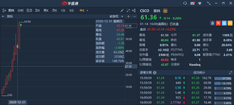 从股价上来看,思科 $CSCO 为走向数字化而做的努力应该是受到了市场认可的,该股去年涨近50%,而且自2011年算起仅2年录得跌幅,表现稳健。