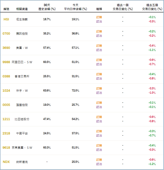 上周五恒指相关权证的平均引伸波幅报约19.1%。个股方面,快手过去五个交易日相关认购证的引伸波幅达3.3%。