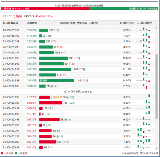 街货分布方面,至上周五,恒指牛证街货在收回价23400点至23900点之间,累计相当约1996张期指合约;恒指熊证街货在收回价24600点至25100点之间,累计相当约4645张期指合约。