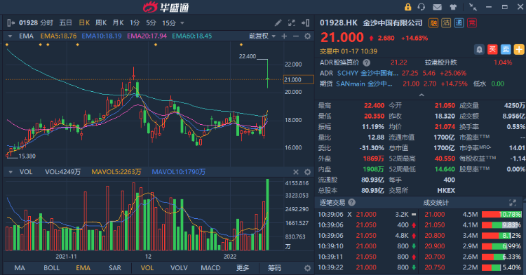 华盛资讯1月17日讯,博彩股集体上涨,金沙中国涨超14%,美高梅中国涨超10%,永利澳门涨近10%,银河娱乐涨6.90%。此前澳门博彩修订草案出炉。