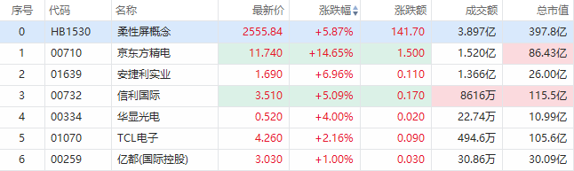 柔性屏概念集体拉升,京东方精电午后涨逾14%