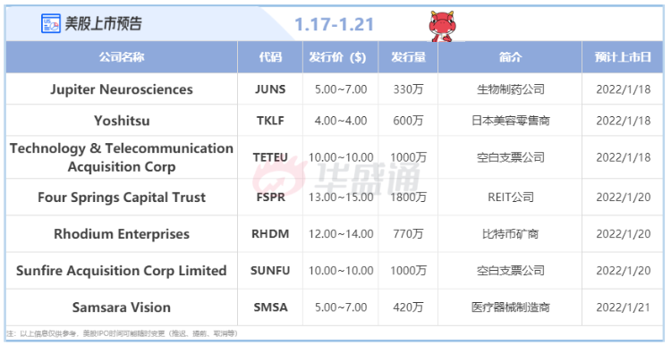 本周市场暂定预计将迎来7只新股,其中包括日本美容零售商Yoshitsu $TKLF 和比特币矿商Rhodium Enterprises $RHDM 。此外值得关注的是,厨卫产品供应商FGI Industrie $FGI 、澳大利亚绿色能源公司Verdant Earth Technologies $VDNT 、胰岛素泵医疗器械开发商Modular Medical $MODD 也可能于本周挂牌上市。