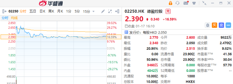 华盛资讯1月17日讯,IP运营商德盈控股 $02250.HK 首挂盘中一度涨逾33%,尾盘收涨16.59%,一手账面浮盈340港元,全日成交额2.47亿港元,最新总市值近24亿港元。