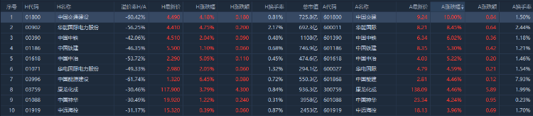截至发稿,中国交建A股涨停,H股涨4.18%;华能国际A股涨8.45%,H股涨4.75%;中国中铁A股涨6.02%,H股涨2.04%。