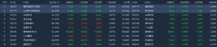 南京熊猫A股跌6.45%,H股跌1.99%;新华制药A股跌6.10%,H股跌3.78%。