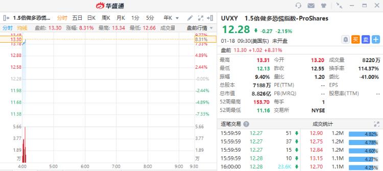 华盛资讯1月18日消息,今日美股盘前,1.5倍做多恐慌指数ETF UVXY 大涨超8%。三大期指盘前普跌,道指期货跌0.71%,标普500指数期货跌1.04%,纳指期货跌超1.6%。